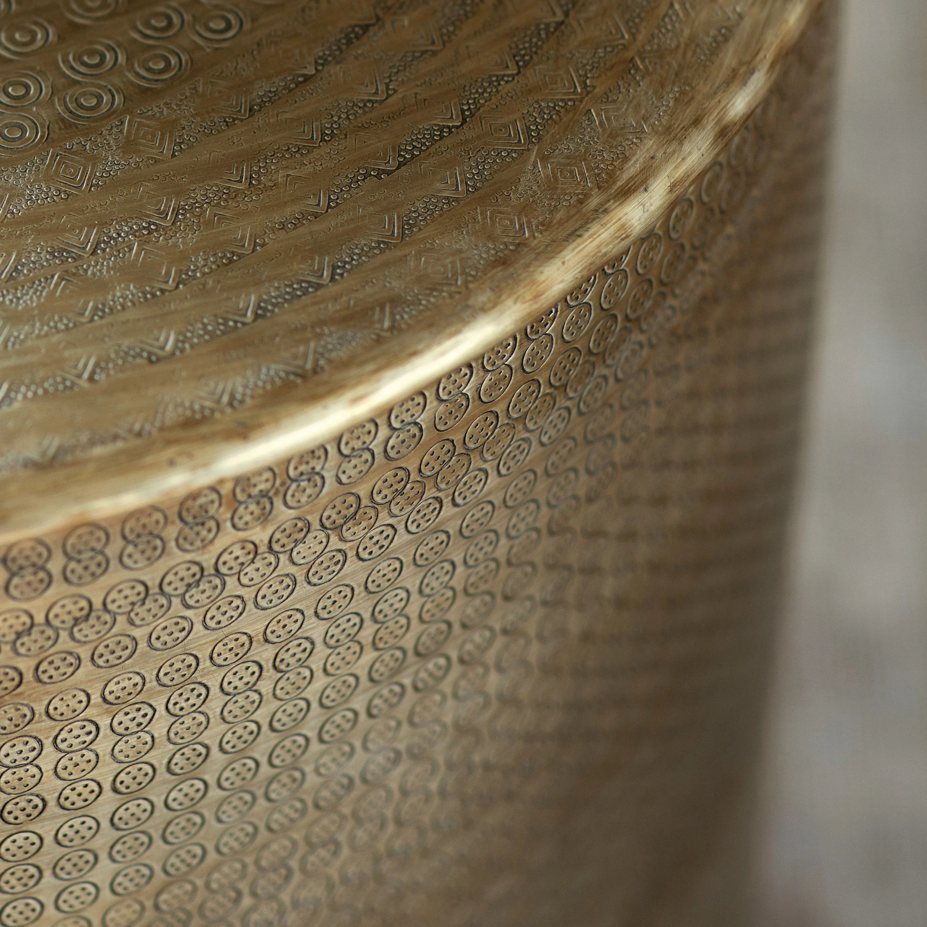 Artisanal style with a contemporary twist. Hand pressed range of embossed metal occasional tables.