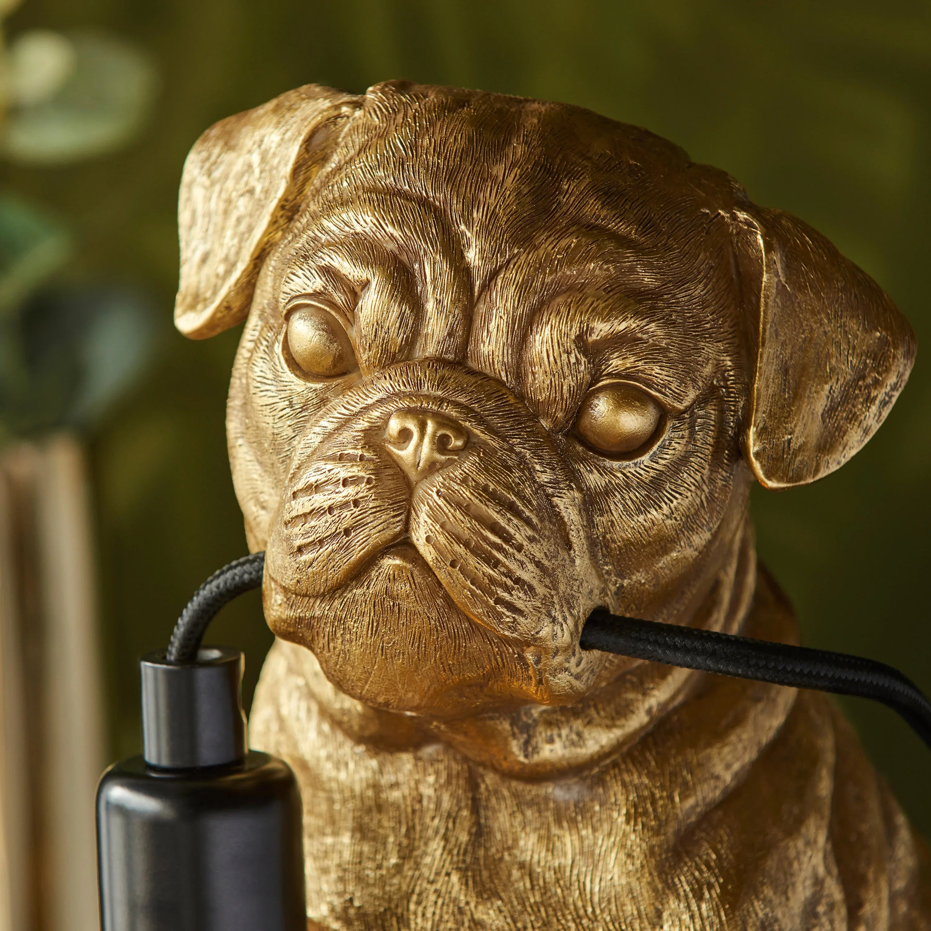 Bring character to any room with the pug puppy table light. Finished with vintage gold paint, this unique light has high quality resin detail from whisker to paw. Twin with E14 LED filament lamp for a stylish 'on-trend' look.