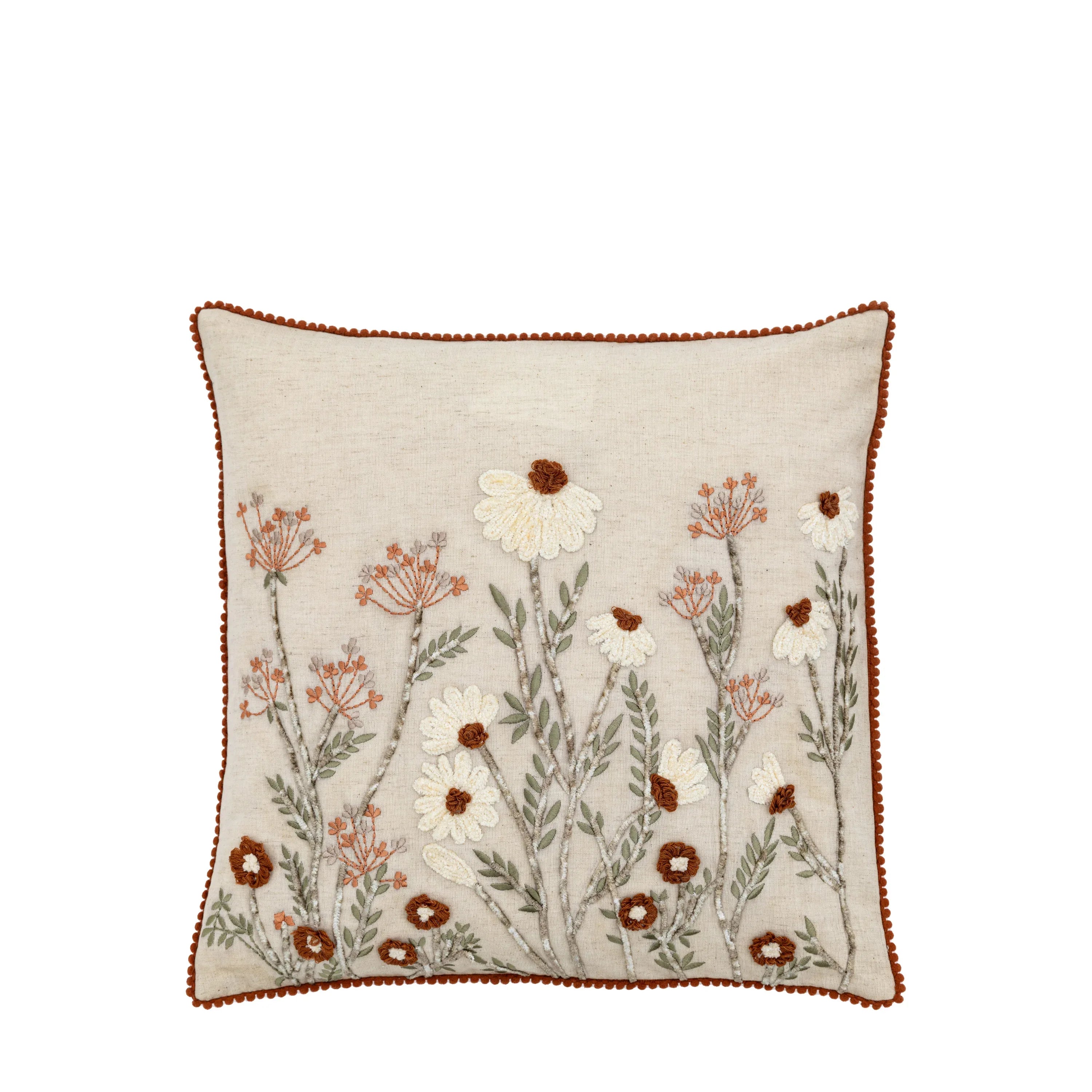Embroidered meadow floral cushion with mini pom pom trim.