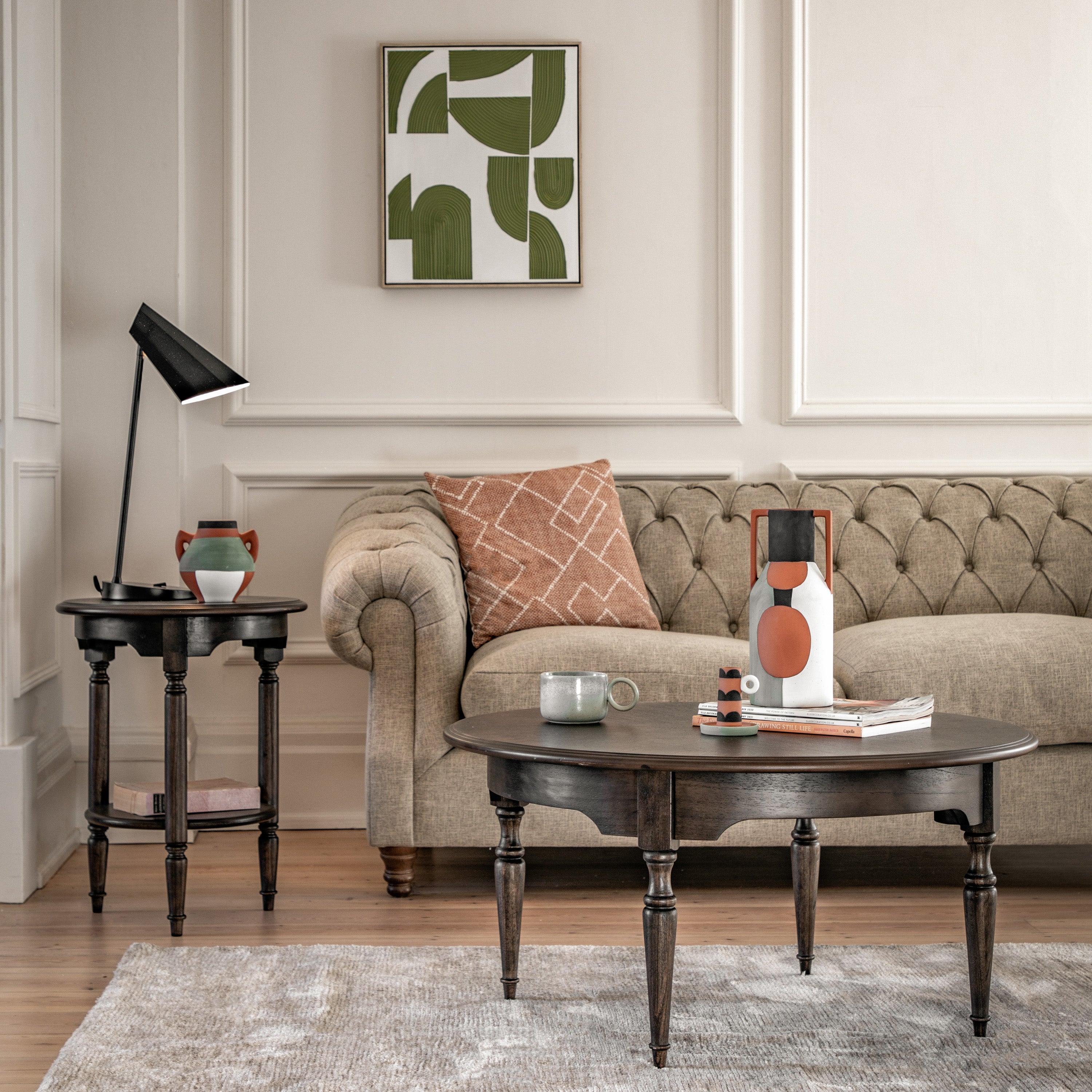 Offering a ‘new traditional’ look, with its timeless, elegant style and a modern touch. This stunning coffee table features exquisite dark salvaged coffee colour finished Mindy wood solids & veneers, with elegant inlaid marquetry details adding a final elegant touch.