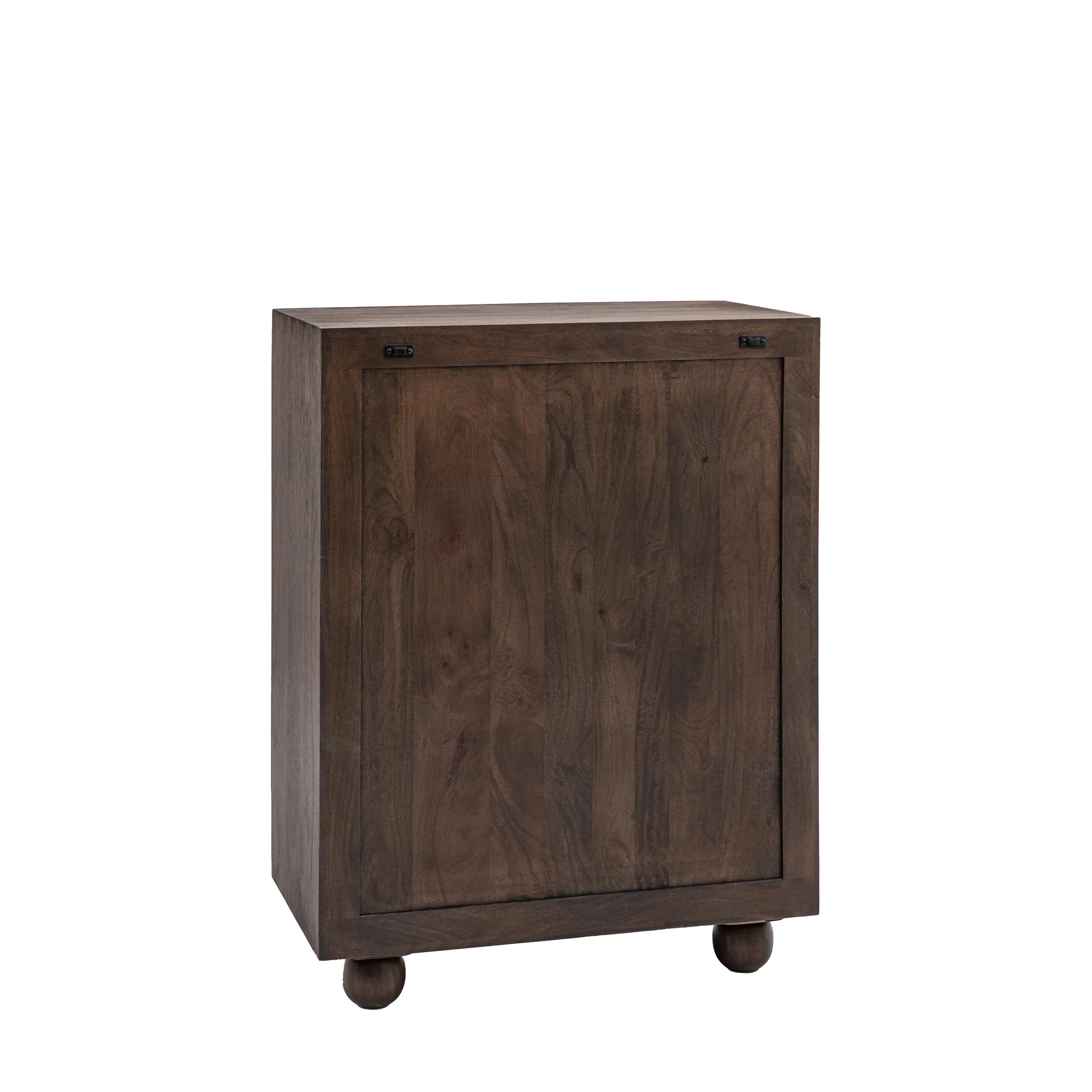 Bring 70s fashion into the present day with this twist on classic retro style. Featuring relief arch patterns and rounded ball feet this 2 door cupboard makes a bold style statement while also being a great storage solution. Made from Mango wood stained to a lovely dark tone to highlight the woods rich grains. Each piece is made from high-quality mango wood, celebrating the natural beauty of the material. With distinctive grain patterns, rich tones, and unique markings, no two pieces are exactly alike. These organic variations add character and charm, making each item a one-of-a-kind statement. Designed to embrace the raw elegance of nature, this product brings warmth and authenticity to any space.