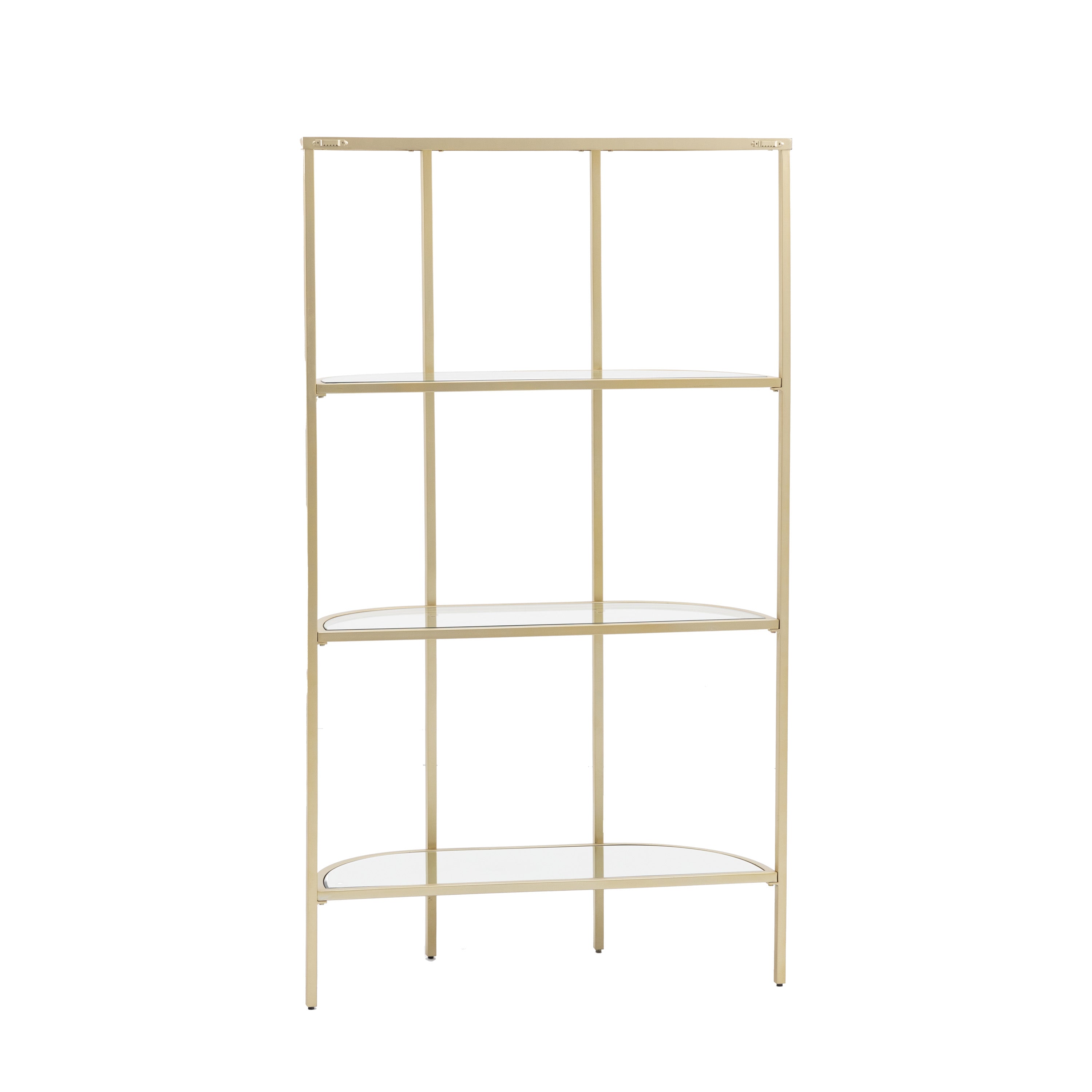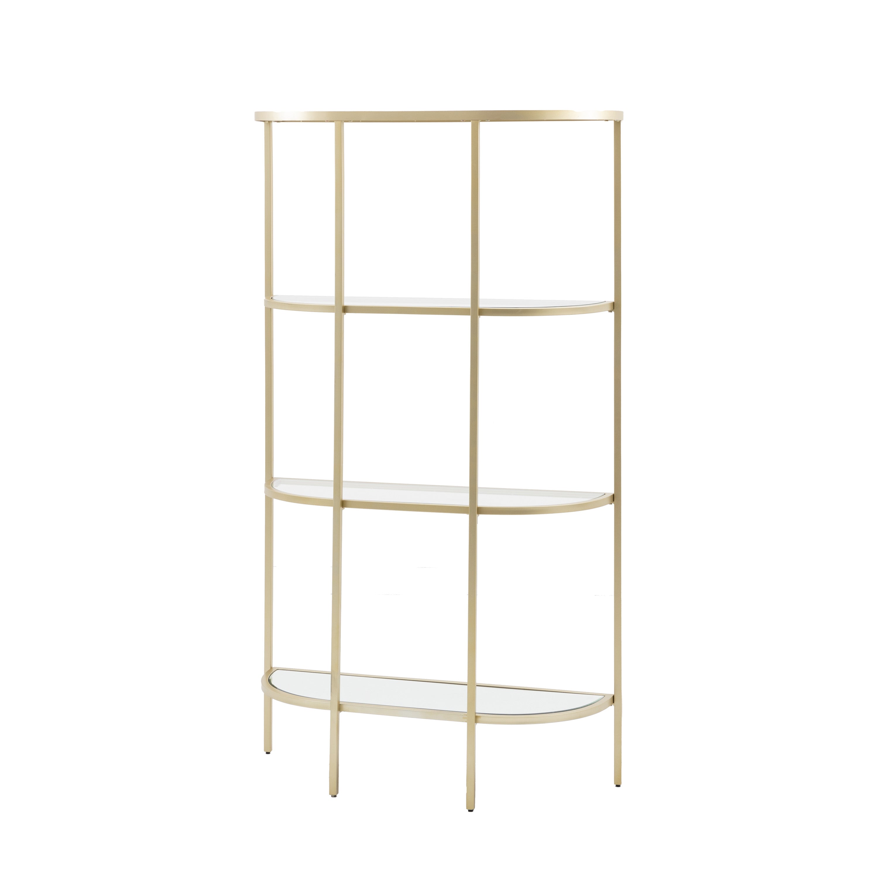 Glamorous 4 shelf display unit with a beautifully elegant curved shape. The 3 glass shelf inserts and a mirror glass bottom shelf sit in a champagne finish metal frame, perfect for adding a luxurious touch to any room.