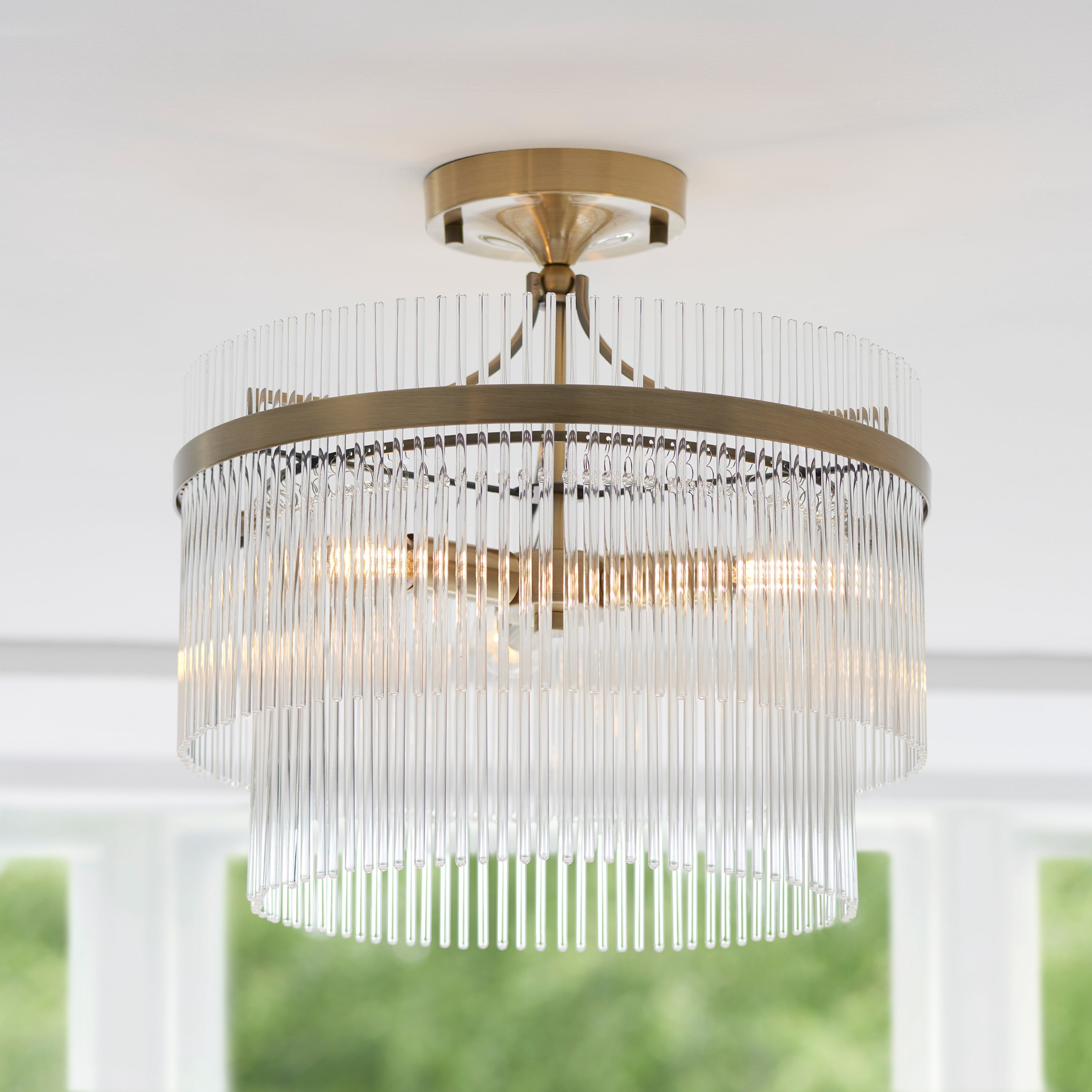 Ideal for adding a decorative touch to interiors, perfect for hallways and bedrooms. Finished in antique brass and decorated with clear glass rods that delicately diffuse the light,creating that classic iconic look.