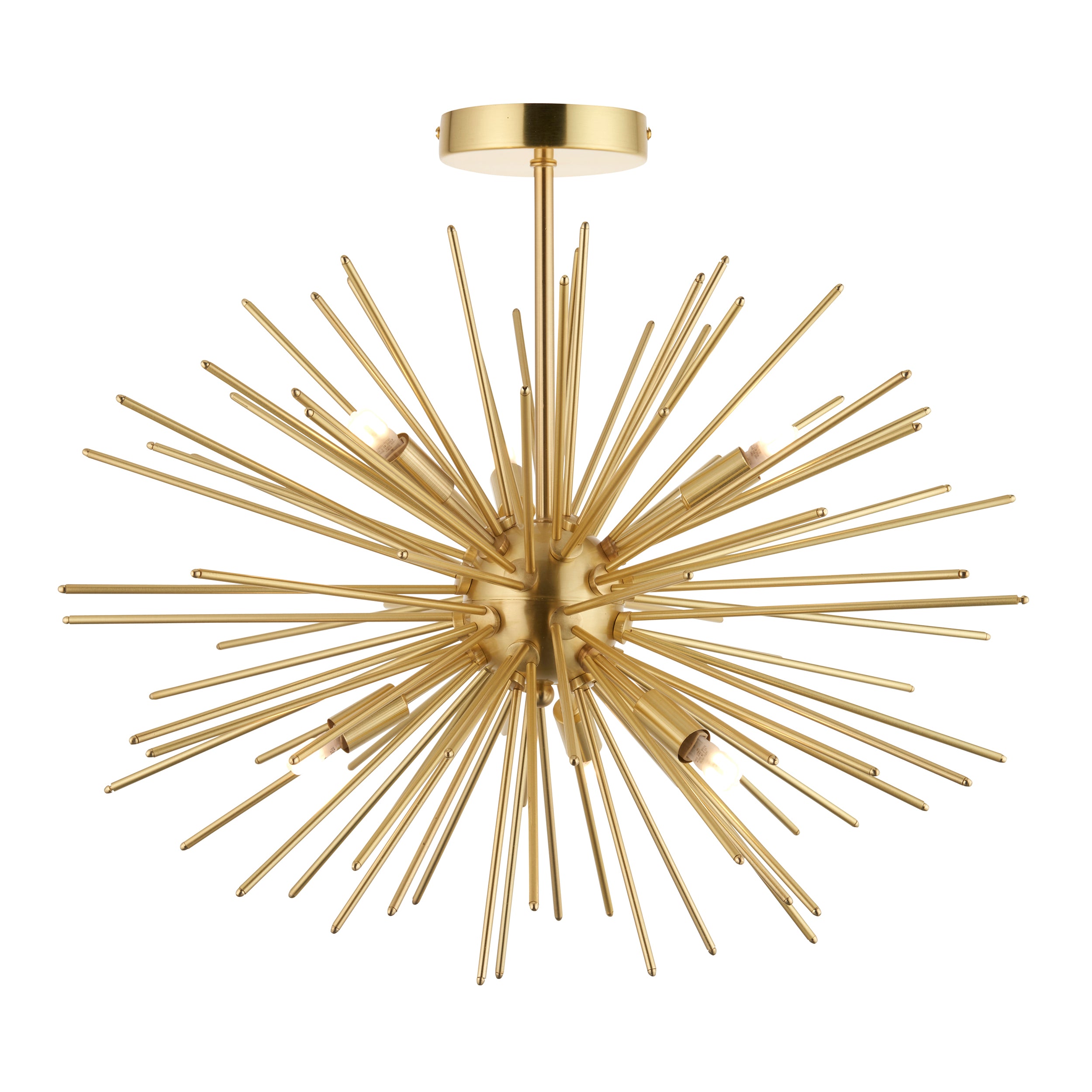 Following the 70's trend this Sputnik style semi flush light is finished in satin gold finish. 6 lights are scattered among the metal spikes creating a stunning centrepiece. This product is fully dimmable. Matching pendant also available.
