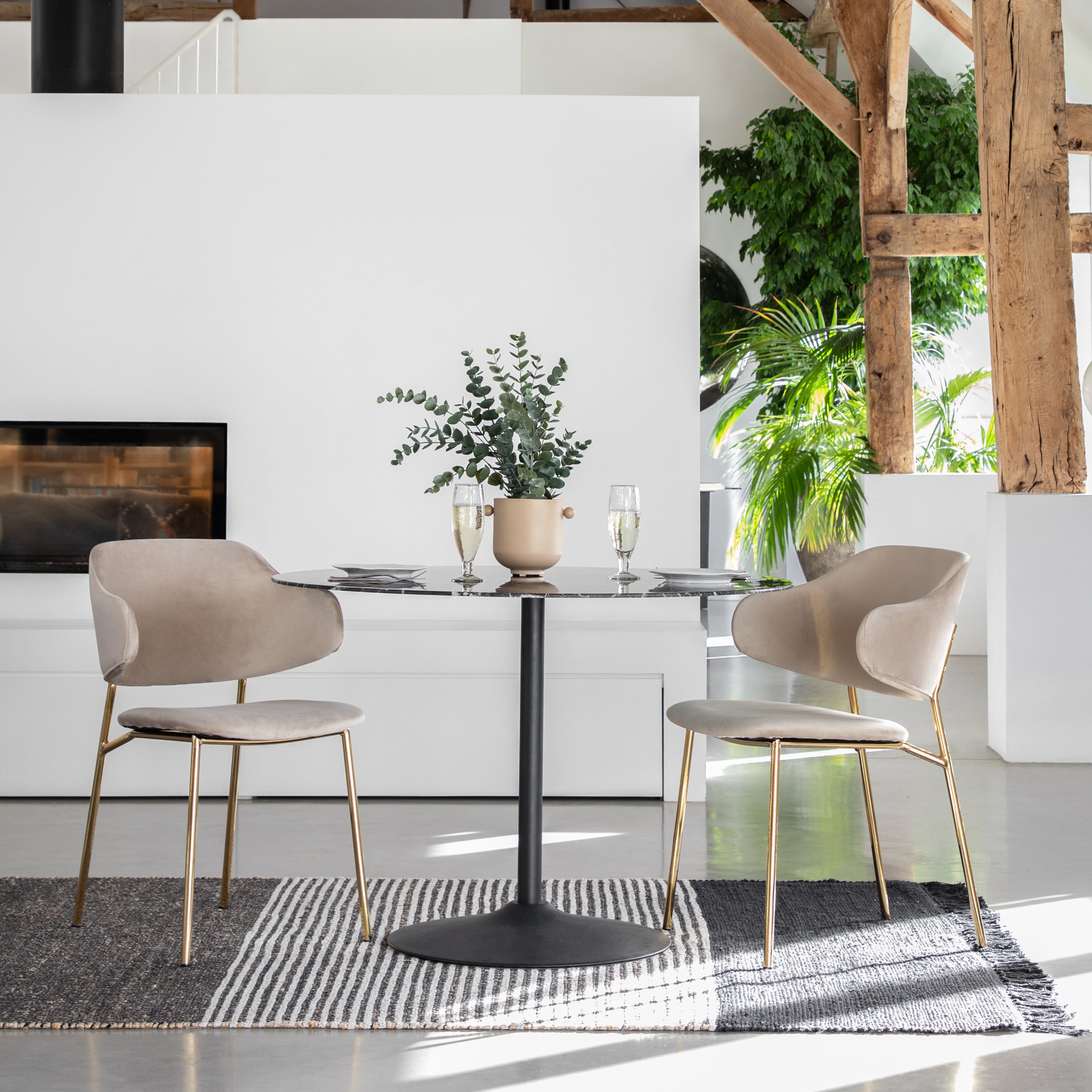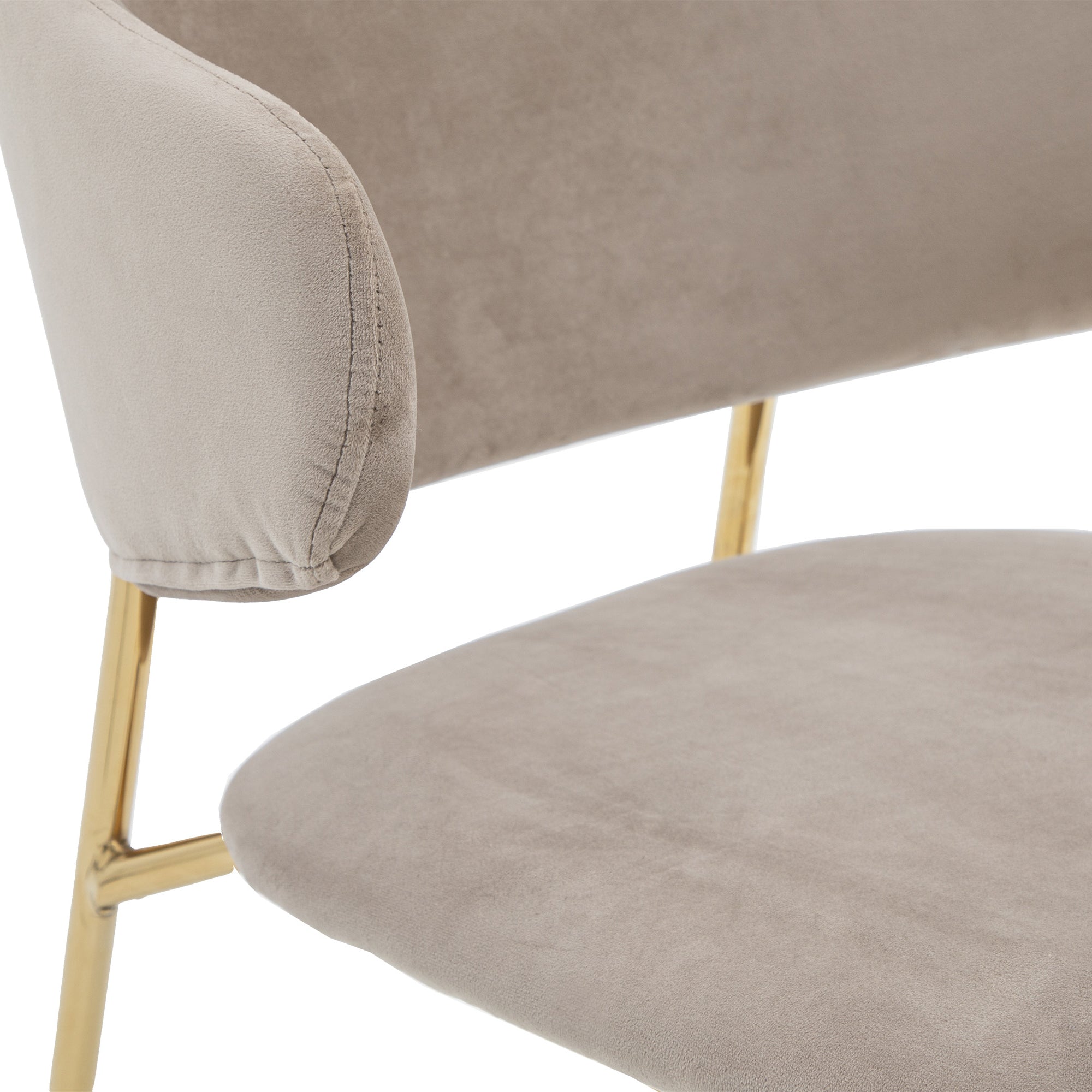 Add a little luxury to your dining space or office. This set of 2 chairs offers contemporary modern design with a hint of old fashion glamour. Upholstered in soft taupe velvet, the chairs feature a unique split design and slim golden metal legs.