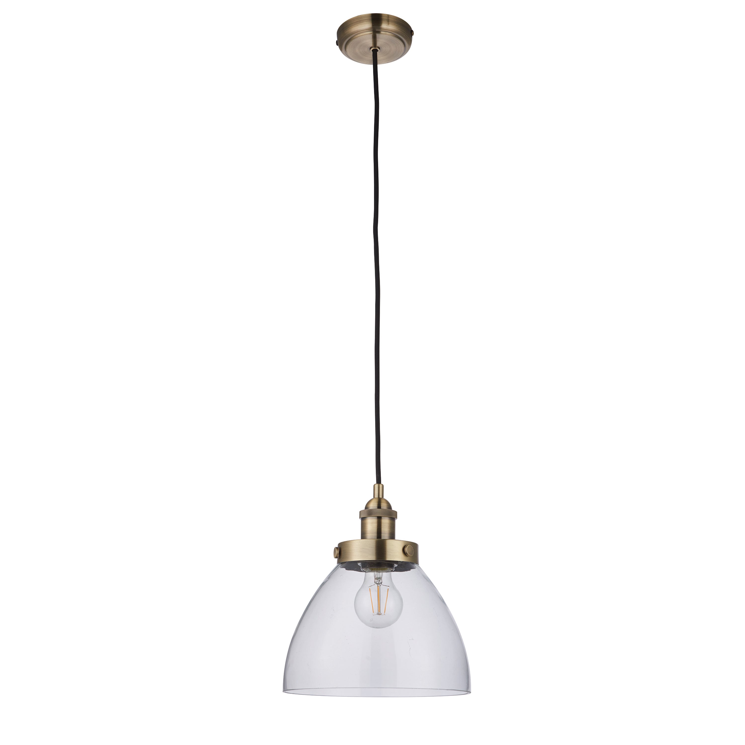An authentic 'resto' style industrial pendant, finished in antique brass plating with authentic knurled lamp holder details and clear glass shades. Suspended from height adjustable black fabric flex, pair with filament LED lamps for that perfect industrial style. The perfect addition for today's stylish homes to create that on trend bar, bistro look.