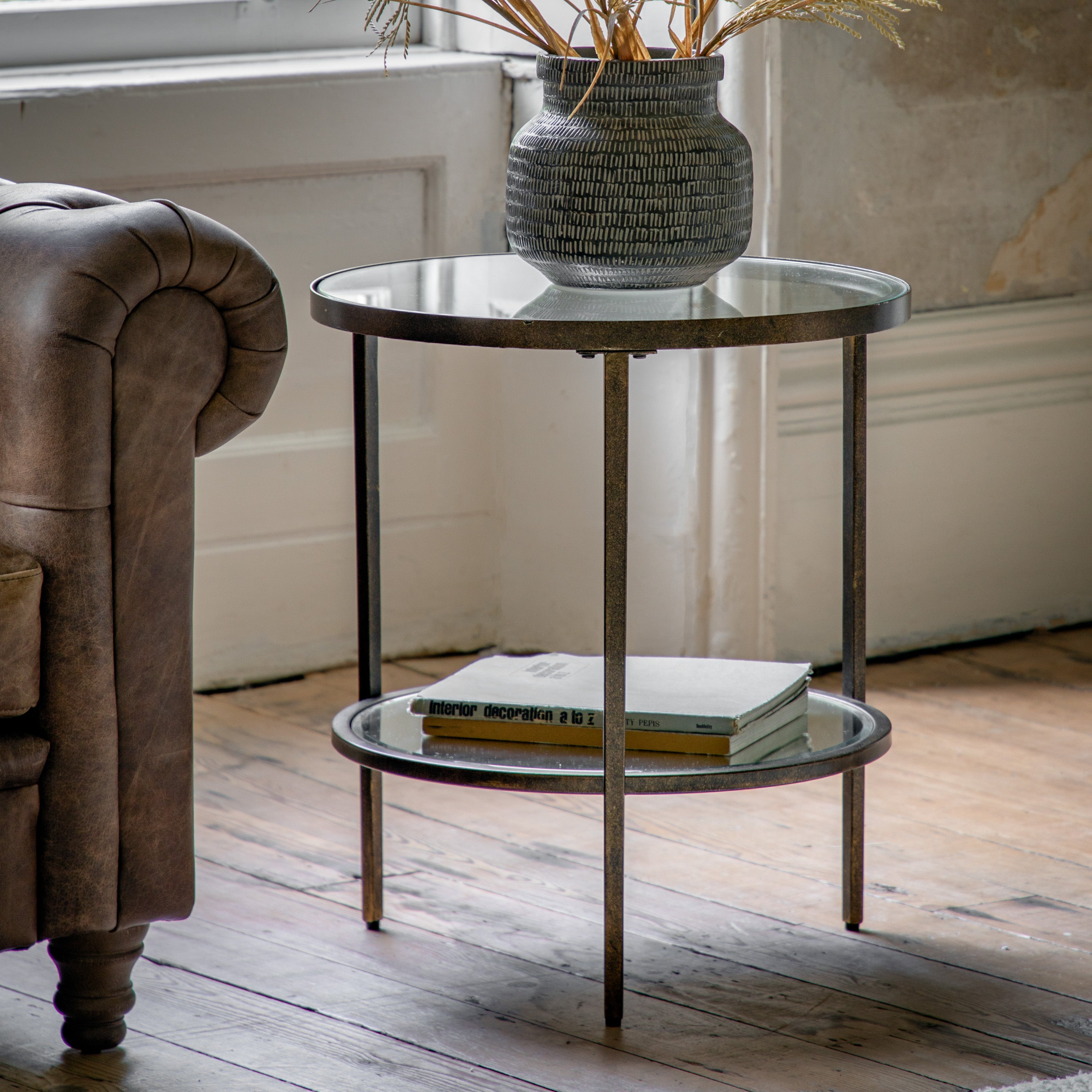 Glamorous 4 shelf display unit with a beautifully elegant curved shape. The 3 glass shelf inserts and a mirror glass bottom shelf sit in a vintage bronze metal frame, perfect for adding a luxurious touch to any room.