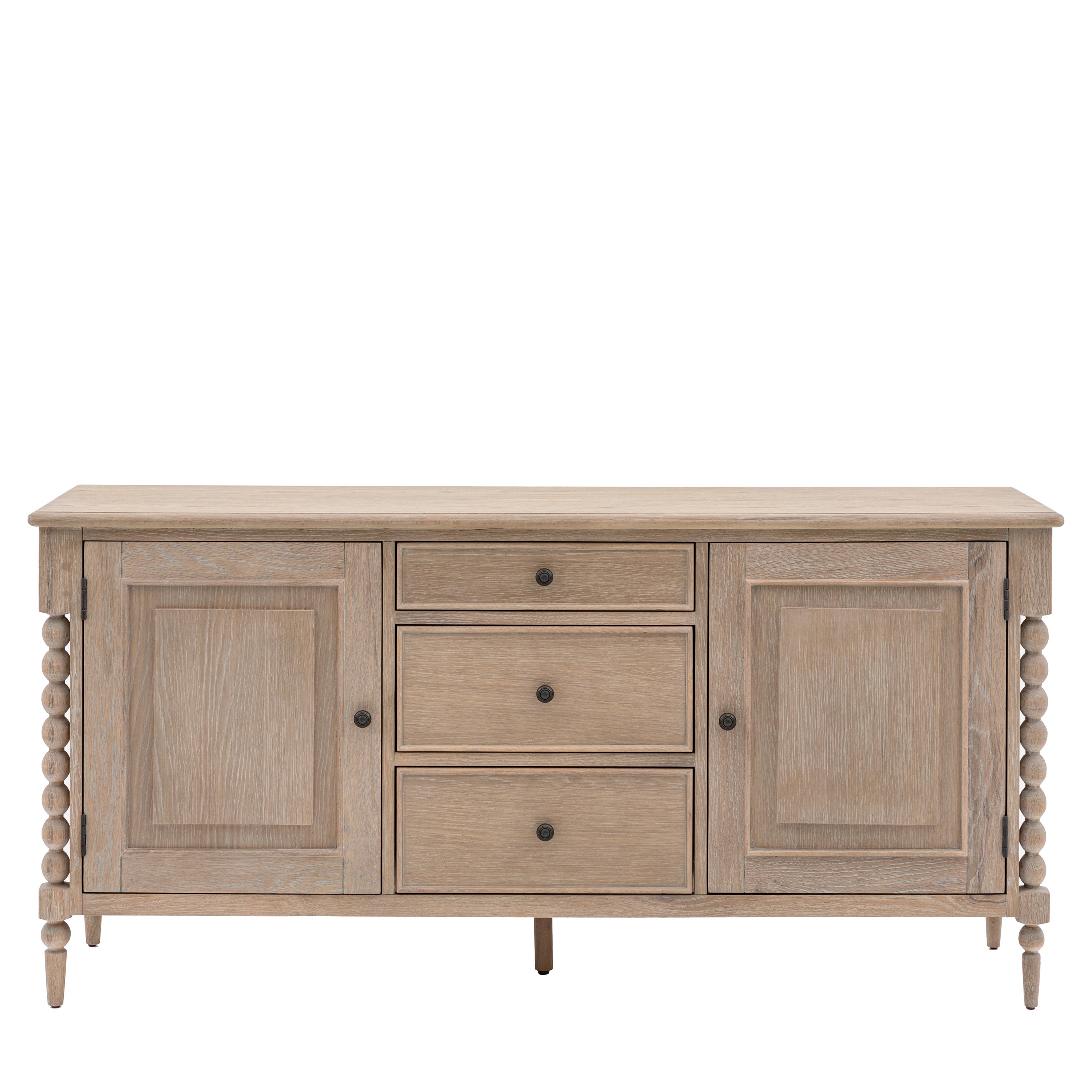 Offering practical storage combined with beautiful design, this stunning sideboard would make a stylish addition to any living or dining room. The play on a classic look emphasises the hand-crafted bobbin detail down each corner. This eye-catching design feature is created by turning the wood on a lathe, a task carried out by the finest craftsmen. The sideboard is made using beautiful oak solids and veneers where practical, with a very subtle lime wash tone to the finish which is soft and mellow. Matching pieces are available.